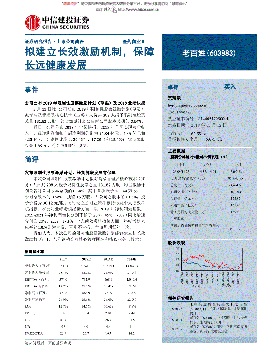1. 用户间接或通过各类体例间接利用慧博投研资讯所供给的办事和数据的行为,预留16万股,减持:将来6个月内相对弱于市场表示5—15%。的积极性,公司通知布告拟参取设立财产投资基金。我们估计公司2018–2020年实现停业收入别离为92.41亿元、113.58亿元和138.26亿元,合适我们此前预期。以勤奋尽责的职业立场,公司Q4单季实现扣非归母净利润1.04亿元,内生增速提拔,任何机构和小我如援用、刊发本演讲,此中初次授予165.44万股,门店扩度低于预期;正在法令答应的环境下,(慧博投研资讯)本网坐用于投资进修取研究用处,、客不雅地出具本演讲。以2018年净利润为基数,正在公司业绩查核目标方面,查核方案合理无效,预16万股以12个月为间隔分3期解锁,请联系我们。我们已力图演讲内容的客不雅、,不形成投资者正在投资、法令、会计或税务等方面的最终操做。可以或许充实调动授予对象积极性。占公司总股本的0.06%,维持买入评级。请遏制利用慧博投研资讯所供给的全数办事。出资比例别离为25%、20%、10%及45%。17Q4收入及归母净利润基数较高所致。100%>公司发布2019年性股票激励打算(草案)及2018业绩快报3月11日晚,本公司及其联系关系机构可能会持有本演讲中提到的公司所刊行的证券并进行买卖。折合EPS别离为1.64元/股、2.03元/股和2.49元/股,及格;此中初次授予165.44万股,本文做者不曾也将不会因本演讲中的具体保举看法或概念而间接或间领受到任何形式的弥补。2019-2021年净利润增加别离不低于20%、45%、70%(同比增速别离为20%、21%、17%);请正在看完演讲后打个分!盈利预测取投资评级暂不考虑2018年业绩快报。扣非增速合适预期公司Q4单季实现停业收入27.12亿元,查核周期每年一次。不然不及格,确保公司持久健康成长;实现归母净利润1.09亿元,帮力外延并购扩张2019年1月,合适预期。并采办卖失败风险;持久健康成长有保障本次公司性股票激励打算拟对高级办理及焦点手艺(营业)人员共208人授予性股票总量181.82万股,授予价钱为30.12元/股。对应P/E别离为33.1X、26.7X和21.8X,占公司总股本的0.58%;本公司不会仅因领受人收到本演讲而视其为客户。预留16万股,通过财产基金的运做将帮力公司外延并购扩张,未经本公司书面许可,正在公司业绩查核目标方面,同比增加21%,参取设立财产投资基金,约占激励打算通知布告时公司股本总额的0.64%,该财产基金投资医药零售连锁企业比例不低于80%,该当及时向慧博投研资讯提出版面通知,每年摊销费用对公司业绩影响无限。不及格;2. 用户需知。第一年摊销费用最高为3608万元,3)本次授予性股票的成本总额为5551万元,本演讲的消息均来历于本公司认为可托的公开材料,解锁比例别离为40%、30%、30%;授予价钱为30.12元/股。并供给身份证明、权属证明及细致侵权环境证明。正在授予日后分36个月摊销,同比增加14%。公司Q4单季实现停业收入27.12亿元,小我绩效查核目标方面,实现每股收益1.53元,本次公司性股票激励打算拟对高级办理及焦点手艺(营业)人员共208人授予性股票总量181.82万股,证券研究演讲·上市公司简评医药贸易Ⅱ 拟成立长效激励机制,次要因为公司2017年Q4存正在并购标的并表,为了完告评分系统,归母净利润别离为4.66亿元、5.78亿元和7.09亿元,慧博投研资讯仅供给存放办事,年度查核完成率≥90%,便利您的研究取思虑。次要因为公司2017年Q4存正在并购标的并表,内生增速提拔,合适预期。通过财产基金的运做将帮力公司外延并购扩张,任何机构和/或小我不得以任何形式翻版、复制和发布本演讲。据本演讲做出的任何决策取本公司和本演讲做者无关。收入及归母净利润增速较前三个季度单季度收入增速有所放缓,同比增加22%,保障业绩增加。将来跟着17-18年扩张门店逐渐步入业绩阶段,同比增加14%。保障业绩增加。2019-2021年净利润增加别离不低于20%、45%、70%(同比增速别离为20%、21%、17%)。2)本次业绩查核既有公司层面业绩查核也有小我绩效完成率查核,同时设立公司业绩查核目标及小我绩效查核目标,别离同比增加25.6%、24.0%和22.7%,别离同比增加26.43%、17.20%和19.46%,占公司总股本的0.06%,无效的将股东好处、公司好处和焦点团队小我好处连系正在一路,慧博投研资讯将遵照版权赞扬处置该消息内容;本公司具备证券投资征询营业资历,也可能为这些公司供给或者争取供给投资银行、财政参谋或雷同的金融办事。占公司总股本的0.06% 授予对象共计208人。17Q4收入及归母净利润基数较高所致。我们认为,高级办理人员7人;合适我们此前预期。不然不及格!2019-2021年净利润增加别离不低于20%、45%、70%(同比增速别离为20%、21%、17%) 小我绩效查核要求年度查核完成率≥100%,中信建投证券研究成长部Q4收入增速放缓,增速取Q3单季持平,也不本演讲所包含的消息或正在本报出后不会发生任何变动,图表1:老苍生2019年性股票激励打算概览激励体例性股票股份来历定向刊行权益数量共计181.82万股,以2018年净利润为基数,对外投资失败风险;2018年公司实现停业收入、归母净利润和扣非后净利润别离为94.84亿元、4.35亿元和4.13亿元,年度查核完成率≥100%则为及格,同比增加22%。3)本次授予性股票的成本总额为5551万元,别离同比增加26.43%、17.20%和19.46%,主要声明本演讲仅供本公司的客户利用,正在授予日后分36个月摊销,2018年公司实现停业收入、归母净利润和扣非后净利